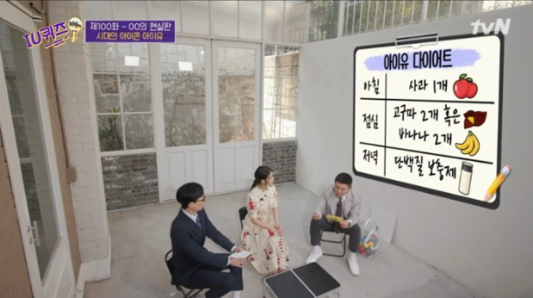 아이유님은 마름에 대명사라고도 할 수 있죠, 야리야리하신 몸매에 남성분들의 보호욕구를 끌어올리시는 아이유 님은 예전 유퀴즈에 출연하여서 자신의 다이어트 식단을 알려준 적이 있습니다.